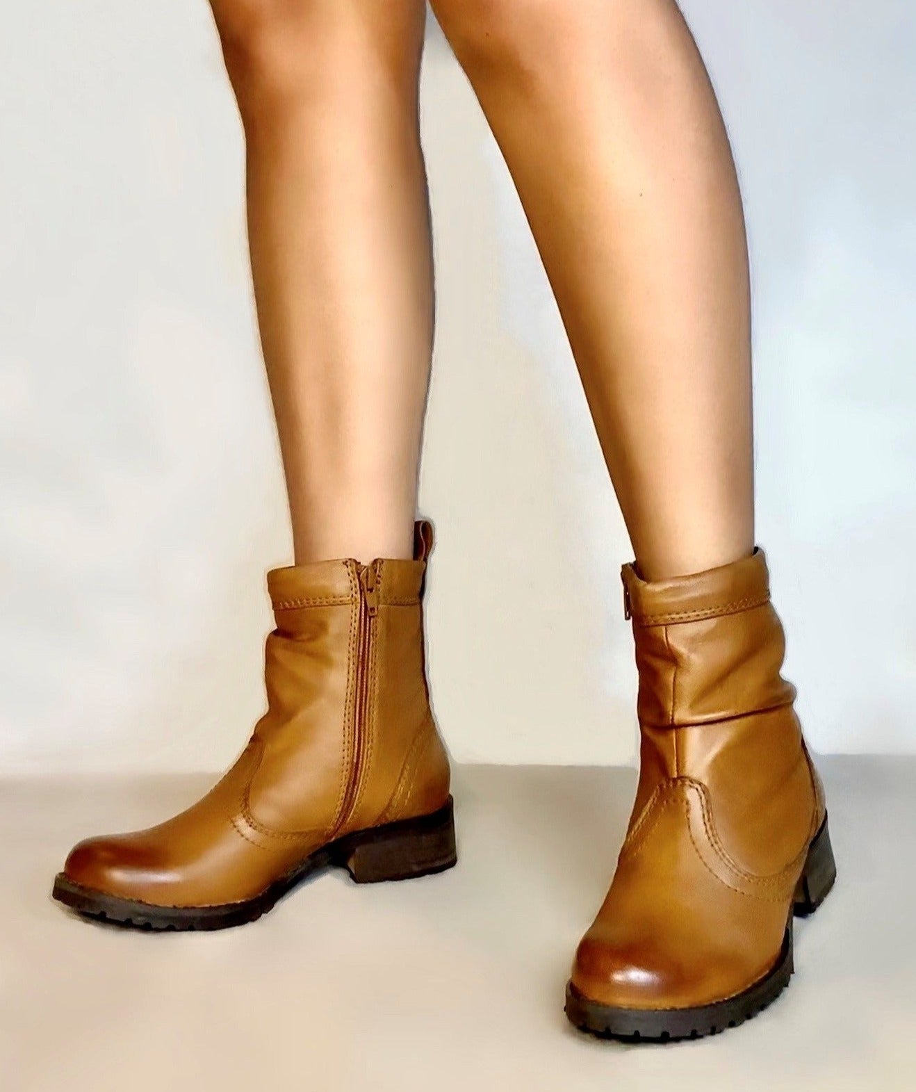 Above the ankle stacked block heel boots featuring a smooth leather upper topped with a slouchy design, chunky block heels with traditional stacking, zippers for easy on and off wear and non-slip rubber outsoles for additional traction.