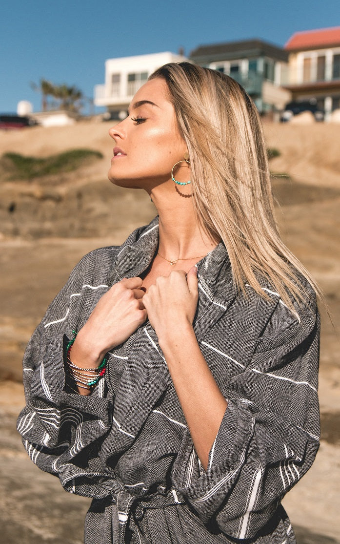 Monaco robe has a timeless and luxurious soft feel, perfect for all seasons. Tailored for comfort with wide kimono style sleeves, deep pockets and a long belt. Use as a coverup post shower or swim or a comfortable and stylish kimono style robe as daywear.