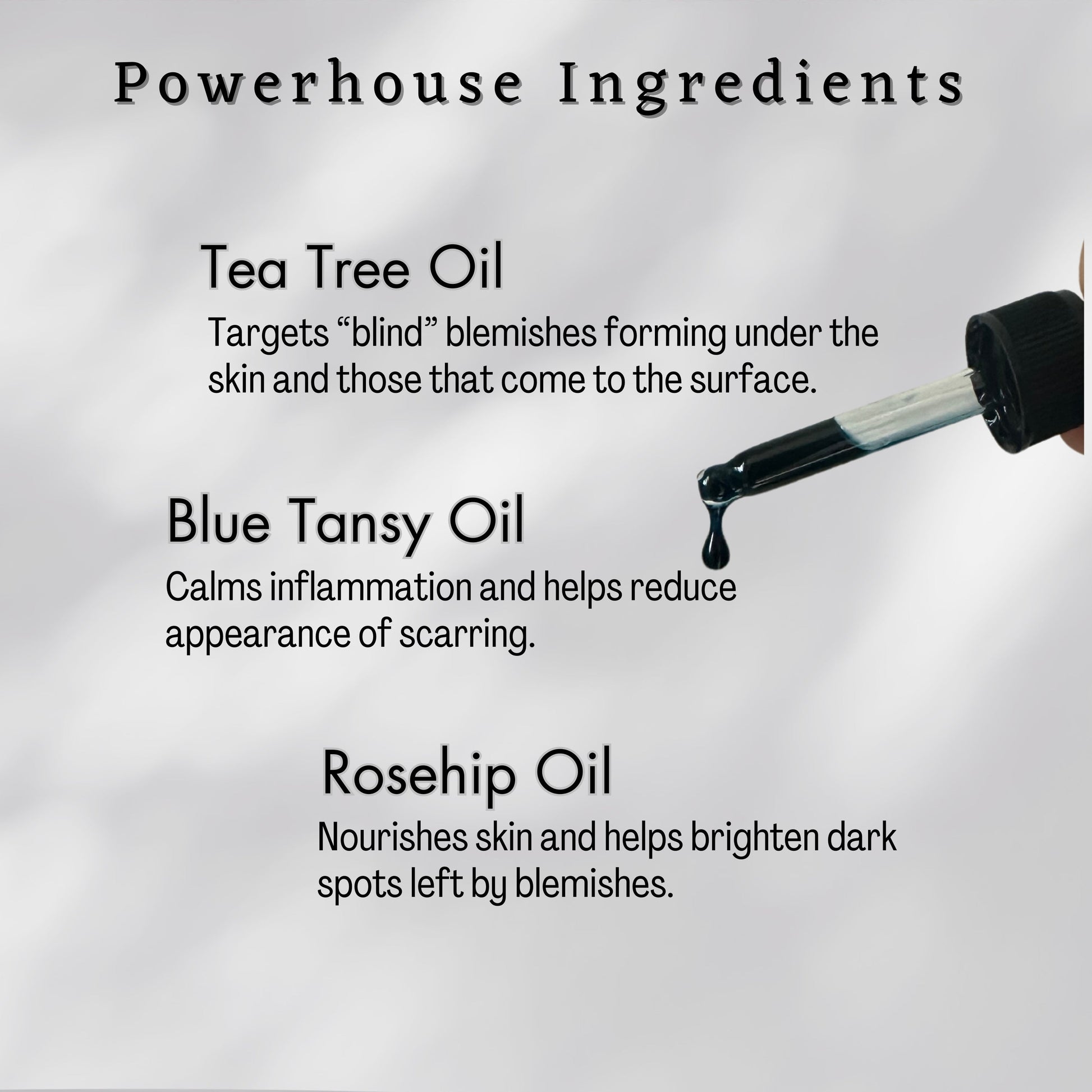 INGREDIENTS: Australian Tea Tree Oil, Rosehip Oil, Blue Tansy Oil